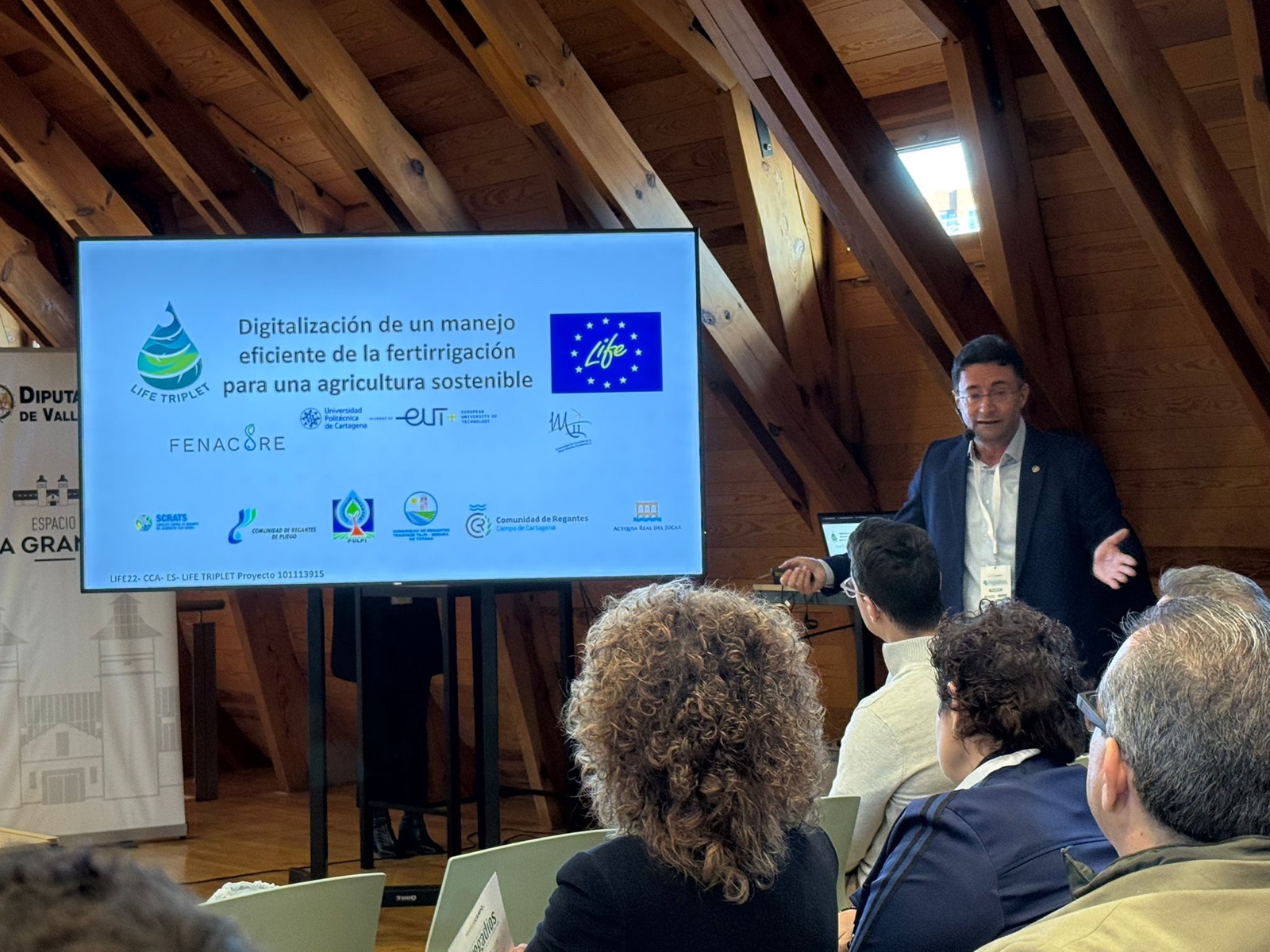 Alejandro Pérez, coordinador de LIFE TRIPLET, ha presentado el proyecto europeo en el V Congreso Nacional de Regadíos de Aguas Subterráneas, organizado en Valladolid por la revista Campo. En este foro, Pérez ha detallado que el proyecto consiste en la implementación de una herramienta digital para monitorizar el manejo sostenible de la aplicación de agua y nutrientes, el desarrollo del cultivo y la sanidad vegetal, mediante la extrapolación de indicadores del estado hídrico del suelo y las plantas obtenidos en las parcelas demostrativas.