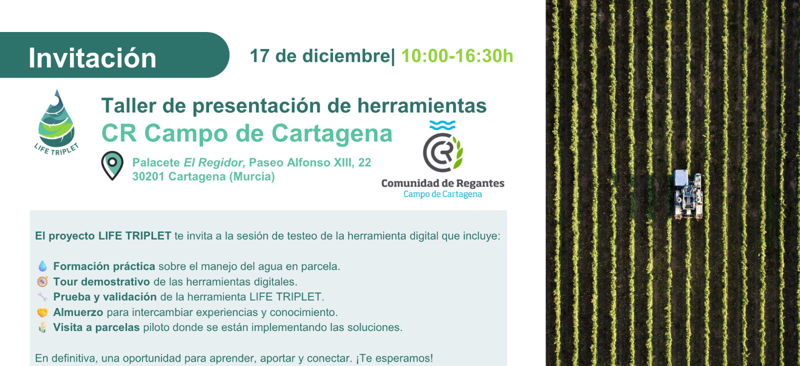 El próximo 17 de diciembre en la Sede de la Comunidad de Regantes Campo de Cartagena, desarrollaremos el Taller de presentación de herramientas sobre el Proyecto Life Triplet.